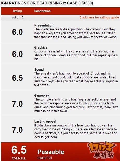IGN目前给X360独占的《丧尸围城2:序章》评分,总分6.5,虽然分数不高,毕竟是个小作品,而且正统游戏已经准备在本月底上市,我们继续期待吧