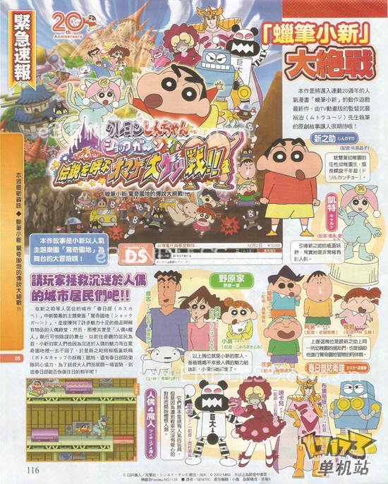 虽然臼井仪人老师已经离我们而去,但是他留下的经典作品《蜡笔小新》系列还不会结束。为纪念《蜡笔小新》20周年,小新活跃的新作游戏将再次在NDS平台上登场。在这次游戏中,小新将在全新的主题公园“ショックガ~ン”内和“模型4魔人”对抗而展开全新的冒险。以下是最新的中文杂志图:(点击查看