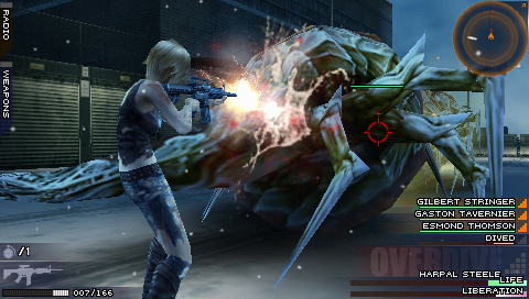 本次的试玩版中,L+○为来复枪,L+□为步枪。步枪可以从远处连射对手将对手打倒,来复枪则可以近处给予敌人强力的一击。另外,L+×可以使用被OVERDIVE士兵所持的武器,比如说像机枪、狙击枪等等,玩家可以选择的战斗方法真是多种多样。
