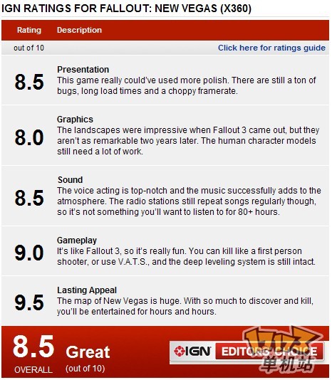 近日系列新作《辐射:新维加斯》发售,IGN继续给出8.5高分评价,虽然看起来更像是为了《辐射》系列的名号所以才给了这么高的评价,然而看来本作依然继承传统再续系列辉煌了。一起来看看评分详情。