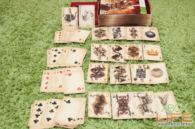 掀开书底、把抽屉打开,裡面是一副《神鬼寓言3》的扑克牌跟公会徽章一枚。徽章正反面的图示不同,上图是红色的邪恶面。