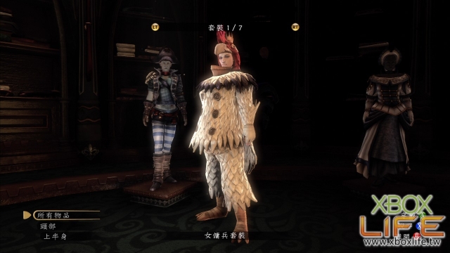 游戏中收集到的所有武器、服装、髮型与刺青等都会自动登录在庇护所内供玩家更换,玩家还能在换衣间裡储存三组服装搭配,方便随时换上。而在庇护所的军械库裡,玩家也能切换自己想装备的武器,每把武器都能自由命名,而达成各武器所设定的条件(例如用槌子打倒500个不死生物等),还能让武器升级进化。