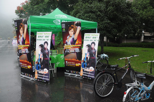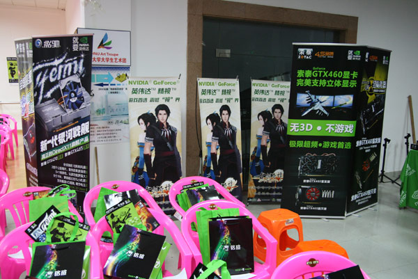 作为第三季度校园行的展示重点,NVIDIA目前最顶级的技术平台——3D Vision Surround(3D立体环绕技术)十分的抢眼,一经亮相就吸引了众多学子的关注。在此次的巡展中,共有耕升,影驰,微星,双敏和索泰等厂商参与,每台试玩电脑除了配置高端显卡以外,也预装了《古剑奇谭》游戏,所有参与试玩的同学均可以凭借强大的显卡性能,体验到更加绚丽夺目的游戏画面。除此之外,更有惊喜大奖等待着所有到场同学,只要参与试玩,均可以得到精美礼品一份。