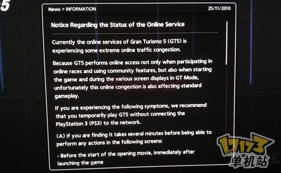 在经历了一次又一次的跳票后,《GT赛车5》终于发售了,但情况并没有想象的那么顺利,有报道指《GT5》玩家受网络拥塞的影响连单机都玩不下去。 据说连游戏菜单都要延迟“几分钟”才能切换过来。索尼称该游戏不仅在多人配对时需要使用网络,而且在启动游戏或GT模式下刷新某些屏幕信息