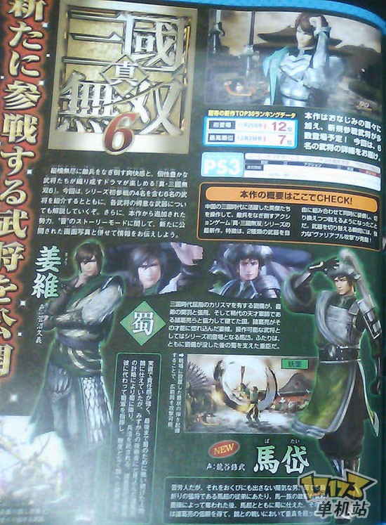 来自日本杂志fami通的消息,《真三国无双》系列新作《真三国无双6》本次放出了6名可操作角色的情报,这6名角色分别有:晋国的郭淮、钟会、邓艾、司马懿,蜀国的马岱及姜维。 《真三国无双6》日本为PS3独占,都没地区登陆PS3及X360。蜀:马岱(CV:龍谷修武) 武器:妖