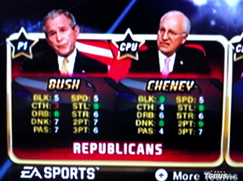 GEORGE W. BUSH: 封堵: 5; 控球: 3; 运球: 8; 扣篮: 7; 传球: 7; 速度: 5; 抢断: 8; 力量: 6; 投篮: 7; 三分球: 6