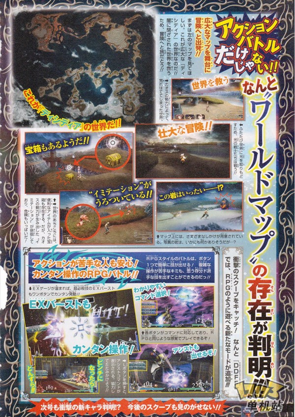 在最新的日本VJump杂志向我们透露了《最终幻想:纷争012》将会加入大地图系统,这比原先采用的棋盘模式要给力很多,在大地图上将会分布着这种“模仿品”及宝箱,类似明雷遇敌。另外战斗中的EX技能操作也将适当的简化,更加的人性化! 《最终幻想:纷争012》登陆平台为PSP,