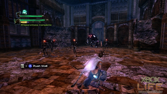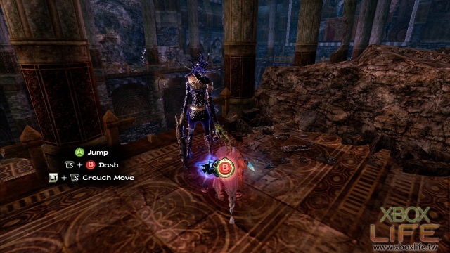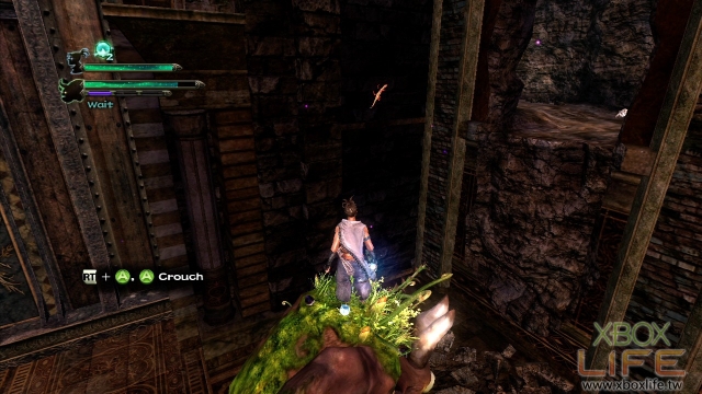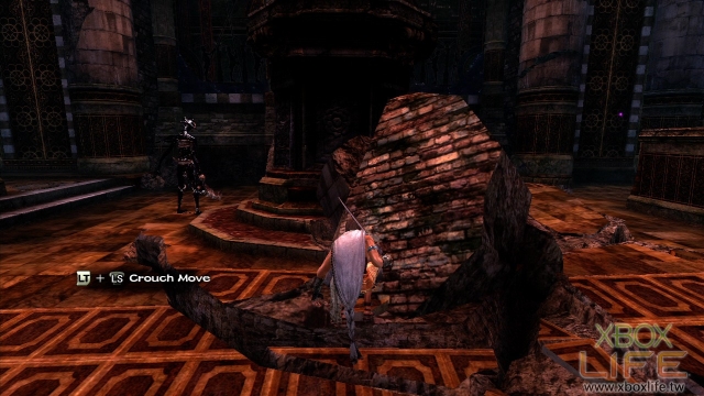靠近大门的右侧,按住RT键连按二次A键命令魔人蹲下,让玩家能爬到他的背上跳到更高的平台上。利用潜行接近敌人的背后,按下手把B键施展背刺清光所有敌人,扳动尽头的手把打开门栓便能再让魔人抬起大门。