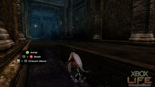 游戏开始后,从下水道尽头左手边的小洞按住LT键(蹲下/潜行)钻过去,沿著唯一的道路前进触发敌人出现。利用潜行移动到掩体的后面避免被敌人发现,过程中特别要注意敌人眼睛的顏色,正常巡逻状态下是紫色、黄色则是警戒状态,而橘红色是攻击状态。顺利通过二名敌人的看守后,随即触发主角被敌人包围的事件,此时玩家只需站在原地故意让敌人攻击即可。