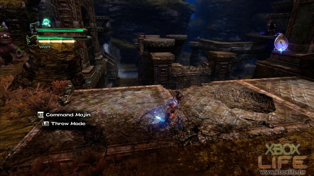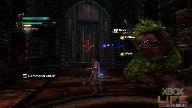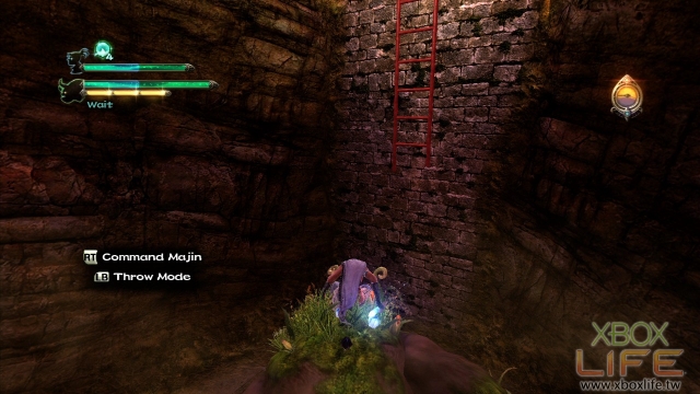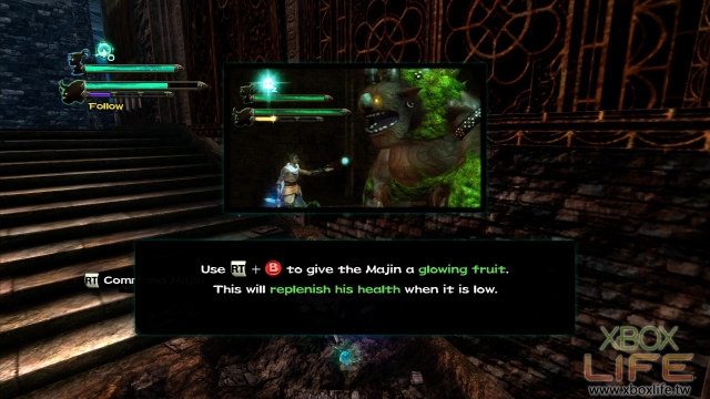 清光所有敌人后,开启魔人指令功能朝著大门按X键,让他把大门抬起来继续前进。路途上别忘了调查楼梯旁的植物取得果实,只要开启魔人指令功能按B键餵食,就能让魔人回复血量。