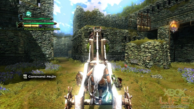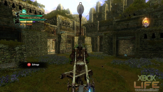 来到Ungdo Flower Patch,命令魔人使用投石车让主角弹到平台上,把三颗石头丢到地面再把石头装到投石车上,破坏掉右侧上方的二道石墙。弹到右边刚破坏掉石墙的平台,走到另一头使用潜行杀掉巡逻的敌人后,扳动一旁的手把打开门栓。