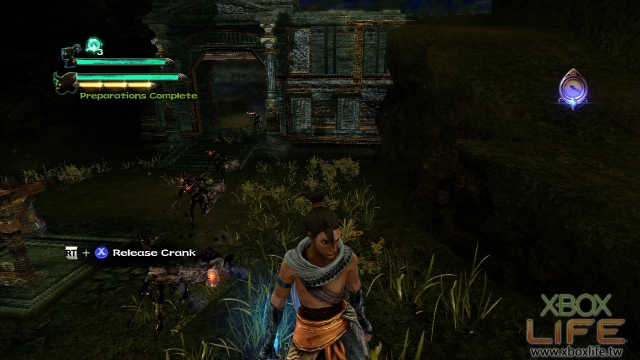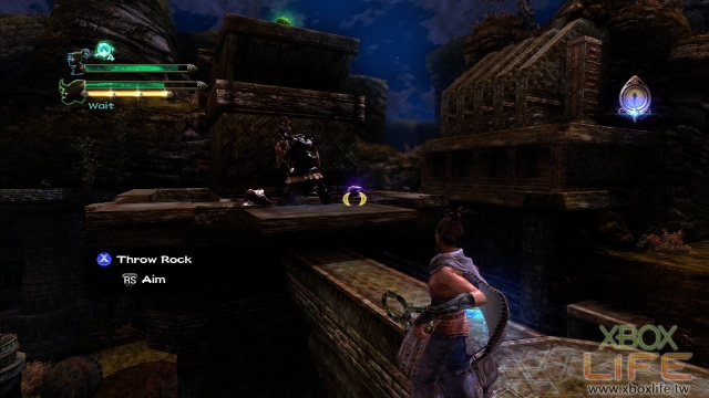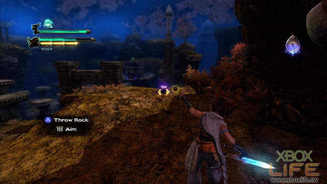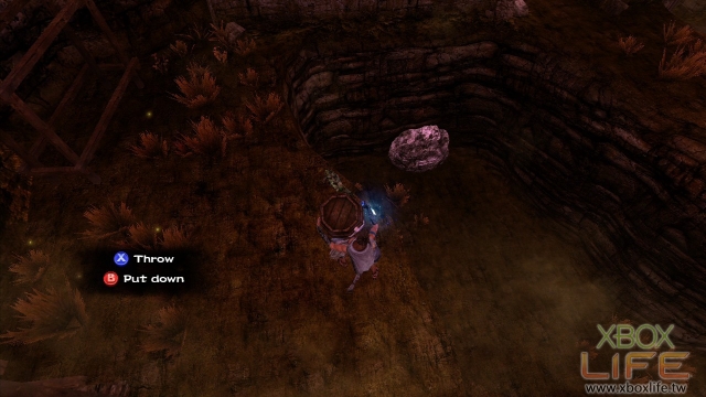这个区域的地上有很多紫色的突起物,如果不小心踩到它的话,喷出的臭气瓦斯会暂时令玩家或敌人无法行动。当看到地上有瓦斯喷口时,可按住手把LB键进入丢掷石头模式,瞄準喷口按X键后可用石头让瓦斯喷出,此时再趁机通过即可。此外,瓦斯喷口也能用来对付弓箭手,暂时瘫痪他们的攻击。