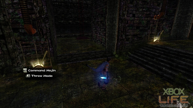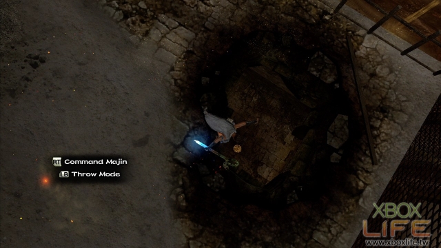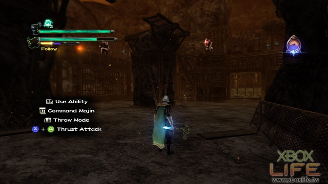 从左手边的小洞钻到另一头,潜行杀掉沿路的敌人后,绕到木桥的另一边扳动手把放下木桥,命令魔人攻击守在山洞口的黑暗犬。因為黑暗犬的攻击力很强,玩家要留意魔人的血量,如果魔人被击倒****会强制结束。建议使用魔人的电击技能进行攻击,可以在最短的时间消灭掉黑暗犬。