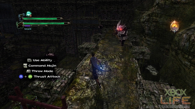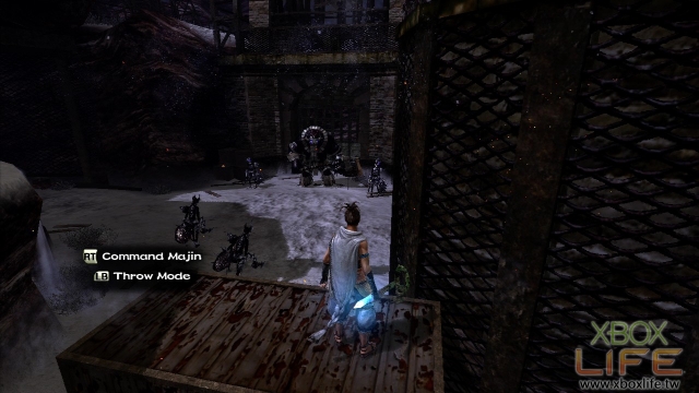 命令魔人吹倒左侧的木桥,玩家会在转角处看到非常多敌人驻守在大门前,利用潜行走到右侧放下另一座木桥。此时千万别一股脑儿就叫魔人往敌群裡衝,最安全的方法是把敌人一个个引诱过来,避免魔人被围殴致死。