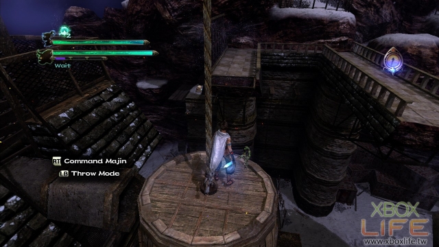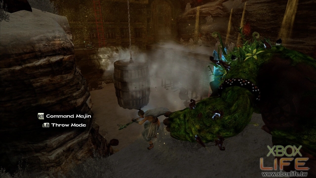 带著魔人搭上一旁的电梯到塔顶,让魔人吹动木桶后,利用木桶的摆动跳到对面的平台上,走到走廊的尽头破坏掉结界。