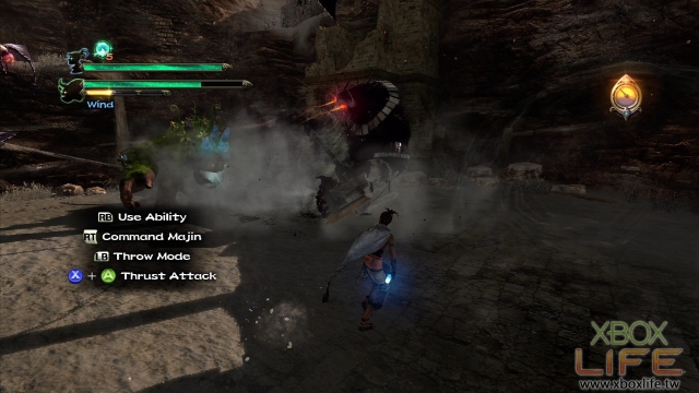 再从地图中的小径绕到大门的另一边,爬上红色楼梯扳动手把鬆开门栓。紧接著再引诱区域内的敌人在石球的前方,最后再命令魔人推动石球压死所有敌人。