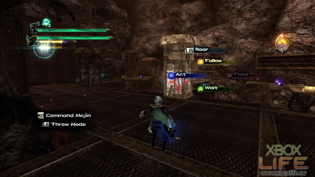 带著魔人回到之前有三名弓箭手的二楼平台,命令魔人推倒石柱后,便能跳入笼子裡破坏结界。
