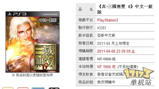 **巴哈姆特网站近日放出了《真三国无双6》中文版的订购画面,亚版中文版的《真三国无双6》为PS3独占,将在4月份发售,距日版发售仅几天,有爱的玩家不要错过了!