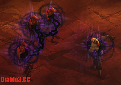 这技能的另外一个重要方面怪物们占用的物理空间。怪物们集中在一起,在D3里他们不能够相互穿过,所以当你在前面链接了一堆怪的时候,后排怪物也会被挡住或者至少速度会减慢下来。锁链本身似乎并没有做出一个晒衣绳状的障碍来,但是在狭窄过道充斥的痛苦之厅和疯狂国王的酷刑室里,把三到四个怪物链结成一团几乎就完全足以阻挡后排任意数量的一大群怪物的前进了。