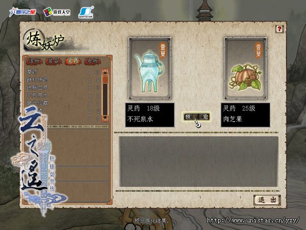 下面我要给大家介绍的,就是我认为是本系统中最有趣、最好玩的一个单元:炼妖炉。炼妖炉不但能炼出妖鬼神魔,也能练出装备道具,只需要两种物品,不管是活物、装备、灵药,还是什么稀有品种,只要放到炼妖炉中,点一下预览,能够炼出什么奇珍异果,就会尽显你的眼前了。其实这里也有一个小窍门,就是所炼得的物品好坏与等级有一定关系:如果你想炼出一些高等级的东西,那就必须使用高等级的原材料,但反之如果你使用了高等级的原材料,却未必能够炼出高等级的物品,所以大家只有通过多使用各种不同的原材料,多次预览,多次试验才能获得你喜欢的东西,这也许就是它的乐趣所在吧。