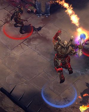 总体上说,这就是你期望的野蛮人。他拥有捣烂一切粉碎一切的攻击,他的形象特别是他的技能声效增强了他的魅力。回到2008年嘉年华我第一次玩到D3的时候,我的一个最清晰的印象就是大量的野蛮人技能声效。即使是通过那廉价的嘉年华试玩耳机(来听),基础技能比如说猛击的低音效果也会让你想去升级电脑的音箱。游戏的音乐很好,不过音效更棒。我注意到今年放出的竞技场视频里音效是多么的混乱而丰富。