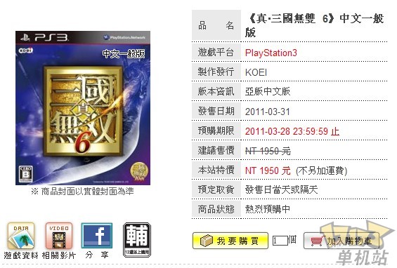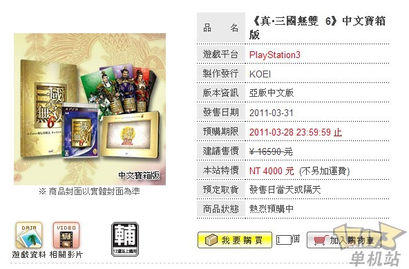 早前单机站报道过《真三国无双6》中文版(PS3独占)将在4月份上旬发售,今天**订购站就正式更新的具体发售日期——3月31日发售。并且还将同时发售再宝箱版,一起来看下具体内容吧!普通版:宝箱版:宝箱版内容:「《真‧三国无双6》游戏软体」一套。‧「《真‧三国无双6》ω-for