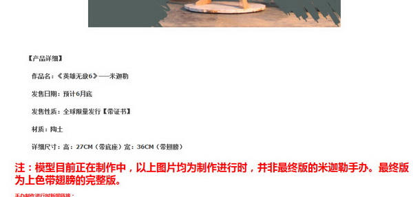 根据这一预购中的商品介绍可知,该人偶预计发售时间为6月底,与《英雄无敌VI》同步发行。发售性质是全球限量且带有限量证书。材质为陶土。详细尺寸为高:27CM(带底座)宽:36CM(带翅膀)。