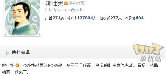 4月8日最新消息,近期《仙剑奇侠传五》的消息不断,昨晚姚仙通过腾讯微博发布消息称,北软正在制作仙5的结局动画,而姚仙将结局动画称之为“最终BOSS”不禁让人觉得仙5的游戏制作已经进入最后阶段。玩家们期盼已久的仙剑5即将制作完成只等与大家见面了。