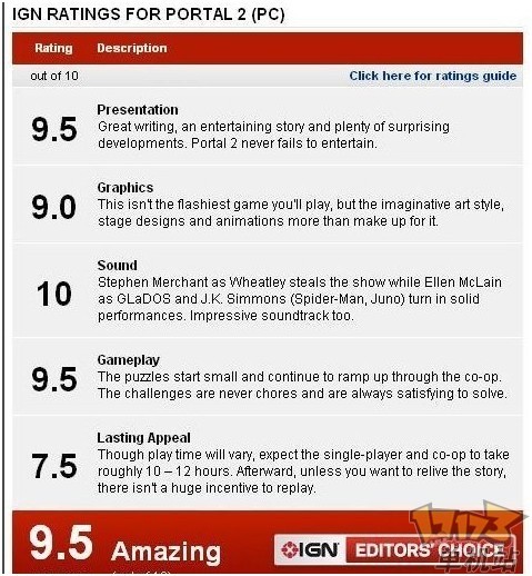 IGN给出了9.5分的高分,可以算是部神作啊!作为FPS解密类游戏,游戏强调了利用周围物体和工具!无论谜题有多复杂,解法都是很合理的。有时你会立刻想出答案,调整激光束激活平台以触发一些开关。还有的时候你尝尽了各种方法却依然不知所措,最终一个极其平常而明显的解法会在你脑海中突然闪现,你只能骂自己为什么这么傻,早一点怎么没想到呢?游戏为你提供了所需的一切提示,而没有在屏幕上显示任何说明之类的东西,在这方面游戏开发商可算是动足了脑子,我只能说这..做的太好了。即使有时候多重机制混合在一起的谜题出现,比如跳跃平台、追踪光束和光桥等等,我也从没觉得卡住是由不合理的糟糕关卡设计造成的,我只能怪自己悟性差了点。