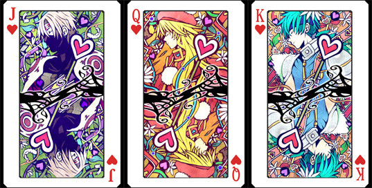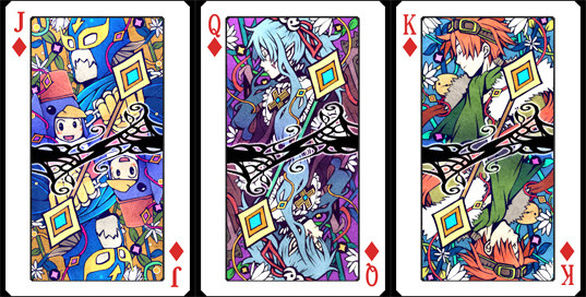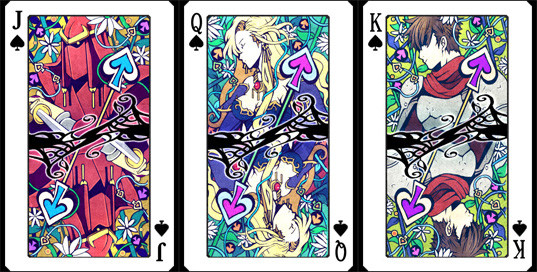 黑桃扑克的图案绘有PSP平台的ARPG『Brandish The Dark Revenant』的男主角亚雷斯和女主角朵拉。JACK上绘制的是在『Brandish3 SPIRIT OF BALCAN』中初次作为可控角色登场的尾白甚左卫门(通称甚左)。