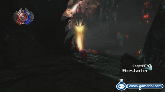 一直到巨大的红色屏障处,从左边的悬崖上去。将巨石用飞锤砸碎后岩浆流出去将红色屏障破掉,再从出口处返回到刚才的红色屏障处。连续飞跃几个狭窄的平台后看到下方的敌人,开始战斗。远处那个空中的发射器会一直向我们射火球,当火球快攻击到我们的时候按LT键可以将火球反弹回去,这样就干掉那个机器了。接下来长犄角的敌人登场,再次解决掉所有杂兵,飞向平台上后一直走到红色门前打开进入。