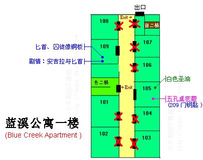 打开二楼左边的消防门,发现隔壁就是蓝溪公寓(BlueCreek Apartment),跳过去后已经在203房间了,在厕所马桶会发现一张纸条记载了保险箱的号码(密码不见得相同),打开保险箱会得到弹药。