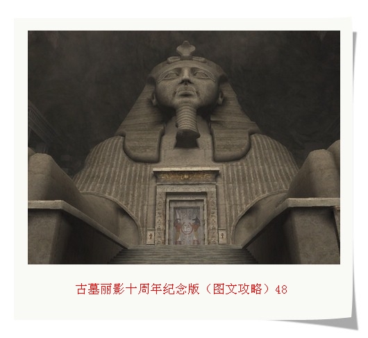 通过后,来到一个大厅中央有巨形狮身人面像的地方。像的前方有一扇石门,左右各有一个需要镶嵌的钥匙,分别对面左右墙通道内取得的物品。