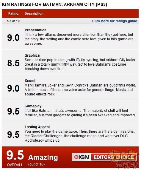 IGN今天给出该作达9.5的高分,不过画面项似乎拖了后腿,只有8.5分。前作也曾一度好评,并获得了众多头衔的年终奖,不过该作在国内的火爆程度似乎与其优秀的评价并不成比例。各项点评内容:整体感觉9.0分:我觉得少数一些恶棍应该得到更多的闪光,不过这样的故事,设定和吸引漫画迷的