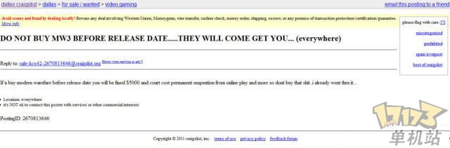 《使命召唤:现代战争3》的泄漏让一位去年因盗版被降级的分类广告网站Craigslist的用户警醒,他遵有关部分发布了一则警告广告,敦促拿到流通盗版的用户移交光盘,否当局就会“找你喝茶”。