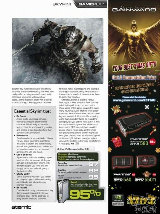 《上古卷轴5》首个评分出炉,由澳洲PC游戏杂志《Atomic》为该作打出了95的高分,在游戏玩法的丰富以及惊人的画质上大加赞赏,称它为“可能是有史以来最壮美的角色扮演游戏”。