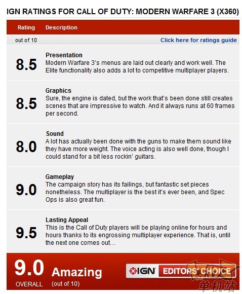 抛开缺陷不谈,《使命召唤:现代战争3》没有辱没这个系列的威名,取得了巨大的成功。多人游戏部分无疑系列有史以来最好的,更多的特性,更多的模式和大量新地图,以及各种与《使命召唤:精英》联动的方式。单人战役和特别行为这款游戏锦上添花,虽然可能没有做到尽善尽美,但是仍然让人无法自拔。