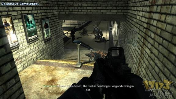 继续跟随队友杀到一条马路上,追到地铁月台上面,坐上货车进行最刺激的追击战。这里简单和普通难度不一定要开枪躲好酒行,老兵的尽量减少敌人的个数,别以为你在火车上人家就不打你。最后车毁人亡只剩下一个基友和我在一起。消灭地铁里的敌人从电梯走到楼上扫清道路后在敌人来到路口摆好障碍,等待货车过来货车来了后开枪将货车打翻然后到货车旁边集合 不一会..货车爆炸了