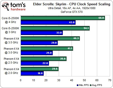前面已经出现过Core i5-2500K成为瓶颈的情况,相信在不少情况下CPU频率对于游戏整体性能的影响更大。从测试结果来看,要想最高级别设置下最低帧数不跌落30FPS,那么你需要一块运行于3GHz的Sandy Bridge平台Core i3或3.5GHz的Phenom II。当然,次高(High)以及中等(Medium)级别对CPU的要求会宽松的多。