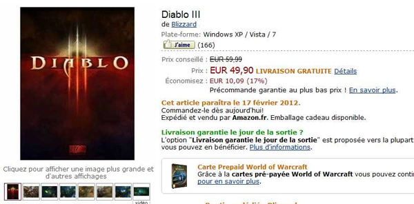 首先公布消息的自然是“大嘴”亚马逊了,当然北美和英国的亚马逊一般比较谨慎,往往是“浪漫”的法国人喜欢说漏。在法国亚马逊《暗黑破坏神3》页面的预定信息中出现了"Cet article paraîtra le 17 février 2012",大意是说游戏将于2012年2月17日公布。当然不知道这条信息不太靠谱还是有所变动,法国亚马逊随后又删除了这条信息。不过由于现在法国销售的游戏往往习惯“官方”偷跑,所以这条不经意透露的消息还是有一定可靠性的“。