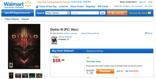 再看看其他购物网站呢,Walmart也注明了游戏发售时间:2012年2月7号,还要更早一些。此外《暗黑破坏神3》还出现在著名游戏媒体IGN公布的”你最期待游戏“列表中,显示的时间仍然是明年2月。
