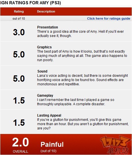 很显然并非所有搭上“生存恐怖游戏”和“僵尸游戏”列车的游戏都会收到追捧。《艾米》就打破了这个常规。也许……制作方所谓的“新概念生存恐怖”就“新”在这里?IGN都忍不住爆粗口了。各项评分内容(由SiLence翻译):整体感觉3.0分:其实《艾米》的核心是有不错的想法的。但你他