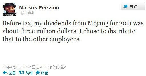 Markus'Notch'Persson,也就是独立游戏神作《我的世界(Minecraft)》的原作者近期在其Twitter上慷慨的宣布:“税前,我2011年在Mojang工作室的股息分红有大约300万美元,我决定将其全部分发给其他员工。” 这条Twitter的回复也全