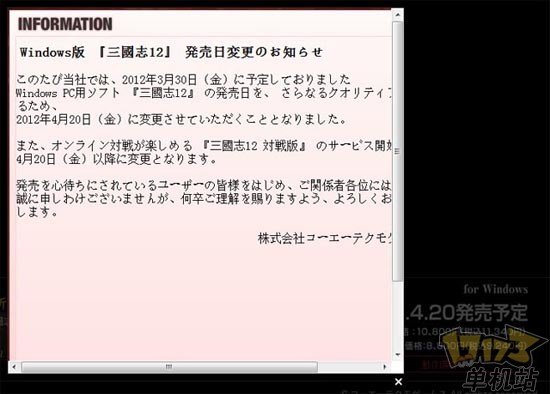 早前我们报道过原本三月初发售的《三国志12》跳票到了3月30日,而今天光荣再次公布了该作延期的消息——延期至4月20号发布,光荣给出的解释可以总结为“为了提高游戏质量”。