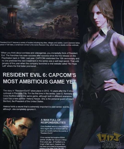 杂志透露,关于几位玩家们非常熟悉的人物,在《生化危机6》中确定会有Ada登场,Jill和Chris在《生化危机5》结束后结婚算是个重磅消息,以后我们得叫Jill为Jill Redfield了,她已经不再担任前线特工,而是作为生物化学武器专家,在纽约继续为BSAA效力;而Helena Harper的隐藏信息则是和前作有联系的。