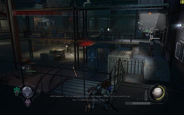 进入电梯,来到最后场景。NEMSIS出现,机关枪威力很大,多找掩体保护。