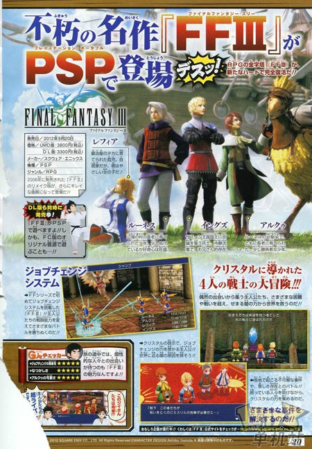 尽管IOS版的《最终幻想3》移植没多久。SE就急着把该作移植到PSP上,该作以2006年发售的NDS版《最终幻想3》为蓝本搭载FC版音源等要素。 《最终幻想3》UMD版售价为3800日元(含税),下载版价格则为3300日元(含税),发售日为9月20日。杂志扫图: