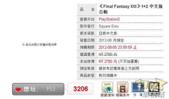 近日来自巴哈姆特订购页面显示,SCET准备推出PS3版的《最终幻想13》1+2中文版合集。这个合集中将包括游戏《最终幻想13》以及《最终幻想13-2》两款游戏的官方中文版,巴哈姆特显示的游戏发售日期为2012年8月,而预订时间截止在2012年8月5日,售价2780新台币。还没有体