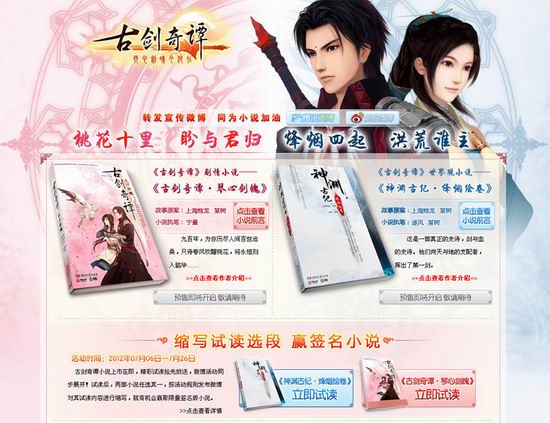 2012年7月10日,《古剑奇谭》即将迎来上市两周年纪念,游戏剧情小说《古剑奇谭?琴心剑魄》和游戏世界观衍生小说三部曲之一《神渊古纪?烽烟绘卷》也将于这一天开启预售,并在七月内隆重上市!剧情小说将为你重现《古剑奇谭》一代游戏的精彩历程,体味百里屠苏对宿命束缚的不懈抗争、感悟