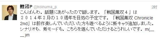 为了迎接《战国无双》系列10周年,光荣预定于2014年推出《战国无双4》。《战国无双》系列制作人鲤沼先生在自己的Twitter上透露“《战国无双4》作为系列10周年的作品定于2014年发售。已经开始构思的同时,也将使得本作成为集大成之作。将会采用用户意见,也许会募集玩家。”